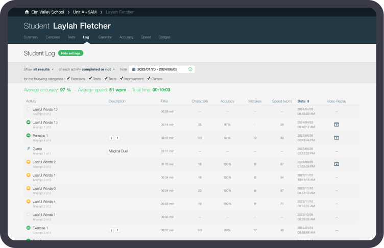 View your students’ logs to assess their performance and watch video replays to identify their strengths and weaknesses. Choose a grading system and generate report cards directly from the statistics report.