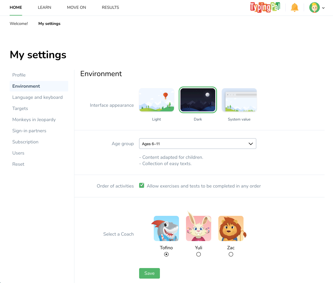 Note—Typing Pal’s settings automatically default to the Ages 6–11 age group with Tofino as the coach and to the interface appearance System value (if supported by the browser). However, you can change these settings at any time.