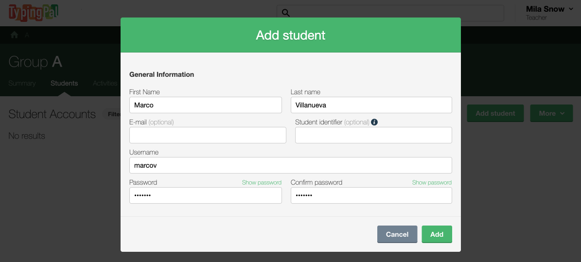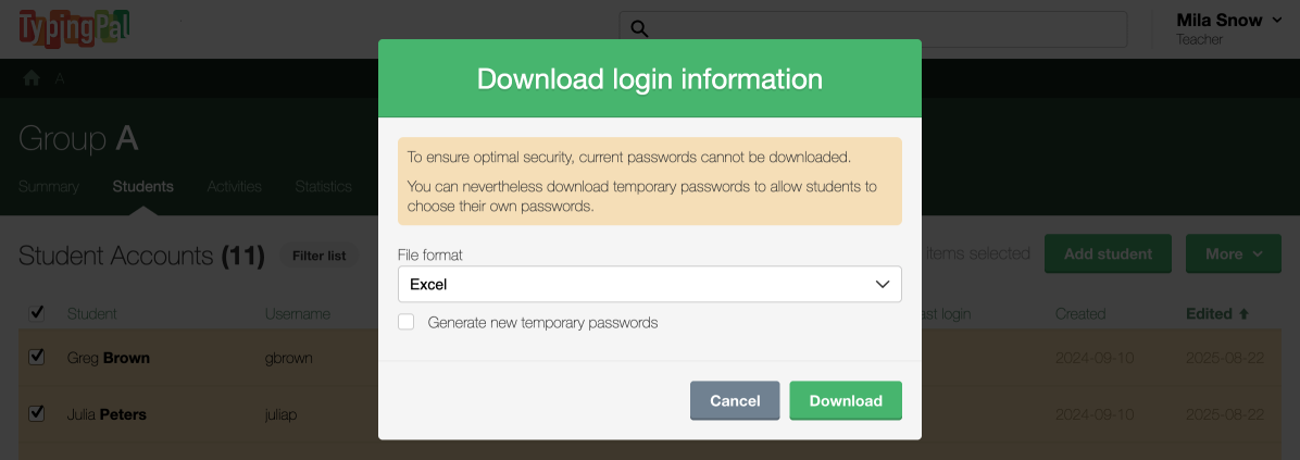Whichever option you choose, we recommend that you provide students with a temporary password generated by Typing Pal. Passwords currently in use cannot be downloaded for security reasons.