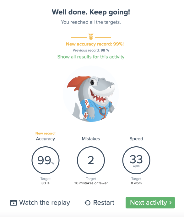When an activity is completed, a screen is displayed showing the accuracy and speed achieved, the number of errors made and any personal bests recorded. A new link has been added to this screen to show all results for the activity in question.