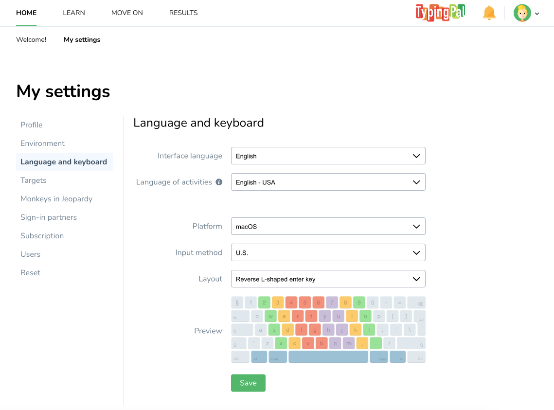 Your Typing Pal subscription gives you full access to both English and French typing programs. The language of activities is associated with its own training program that records your progress. You can therefore change the language of activities at any time without losing the progress associated with it.