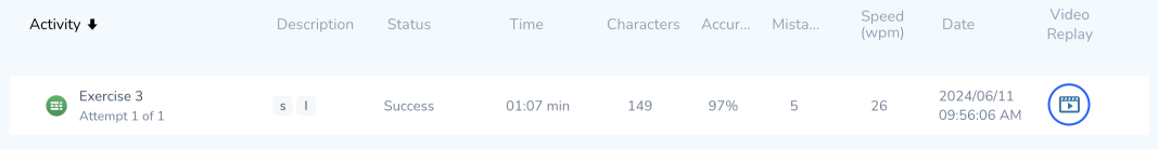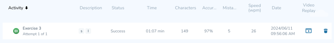 Speed and accuracy are an indication of skill level, but these statistics don’t always show much nuance. Use the video replays in your Activity log to enrich your assessment. Just click the video icon to the right of any activity listed.