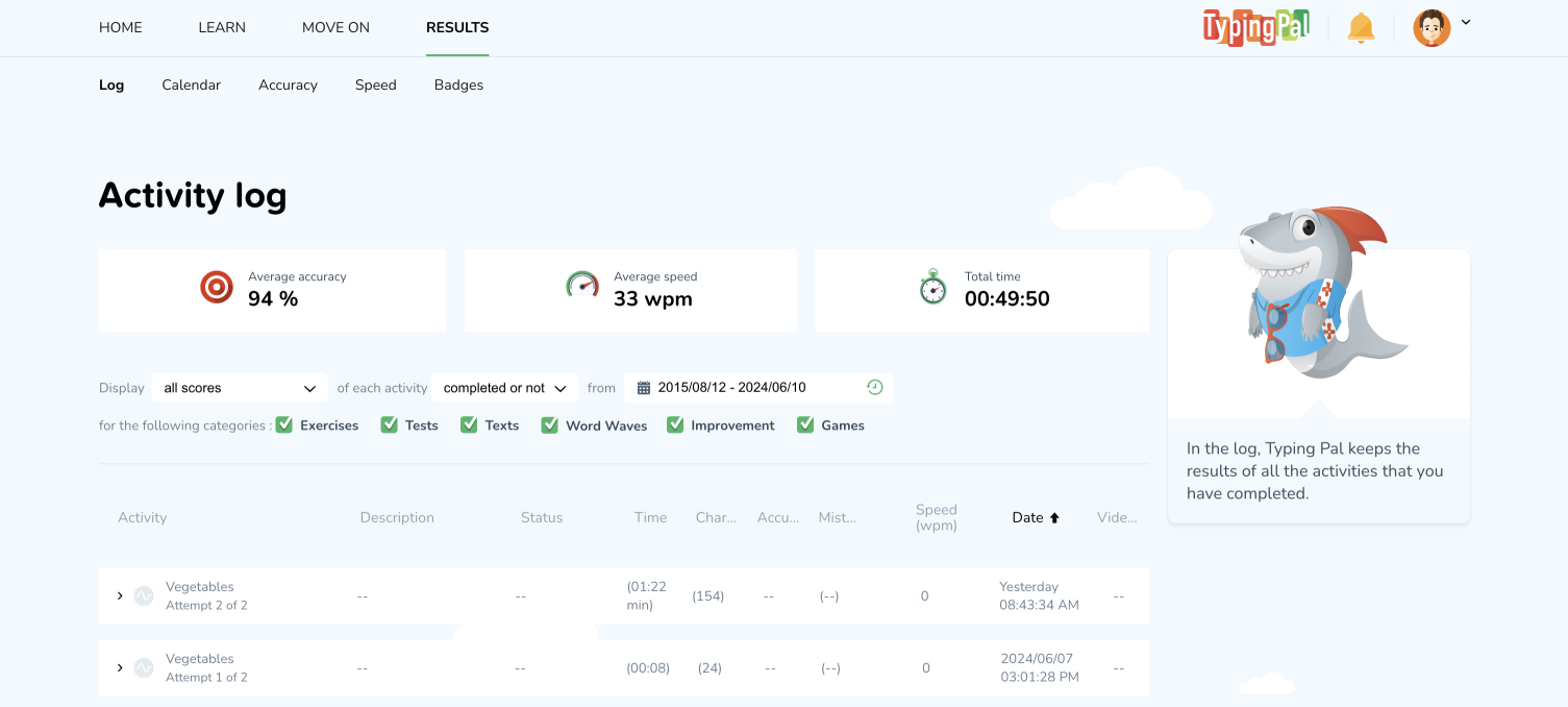 Filter your activities by checking or unchecking the boxes beside Exercises, Tests, Texts, Word Waves, Improvement and Games, and by choosing from the drop-down menu whether to show all exercises, including those you have not completed, or to show only completed exercises. By selecting a date range from the calendar menu, you can also filter activities by date.