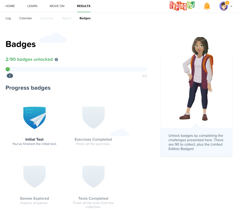 Make sure to collect all the badges by completing all activities and exploring everything Typing Pal has to offer. Access your collection by clicking the Badges link from the Results tab.