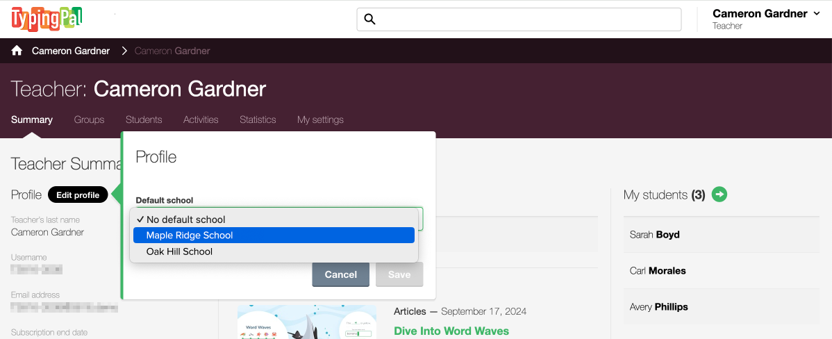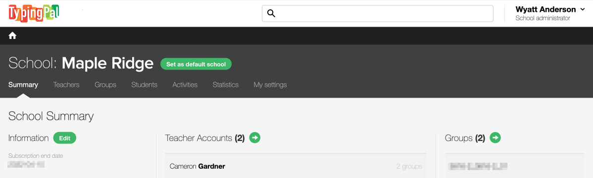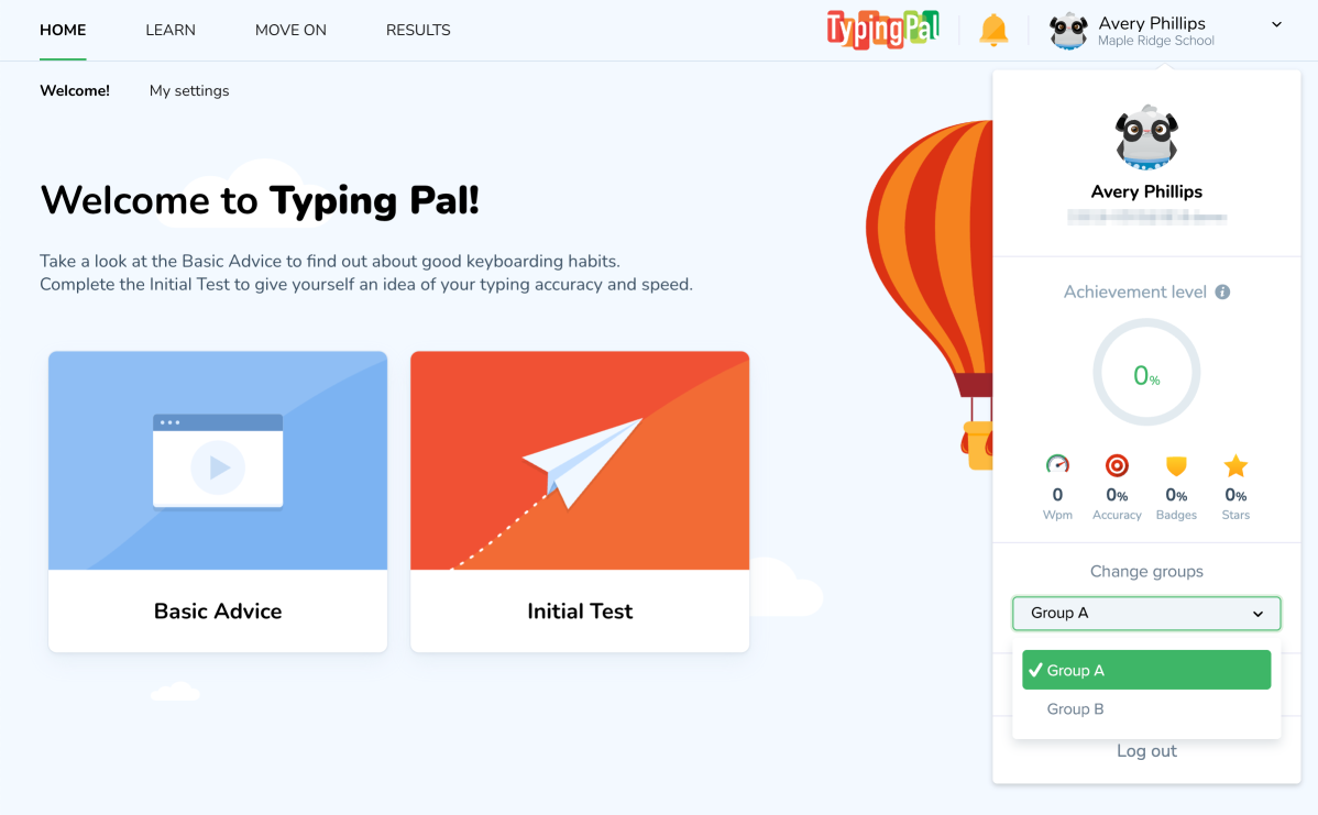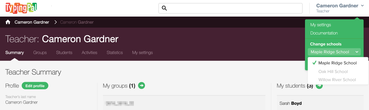 If an account is part of multiple groups or schools, the user can switch from one to the other in Typing Pal. While this feature is very useful for teachers and administrators who are part of different schools, students must use it with caution.