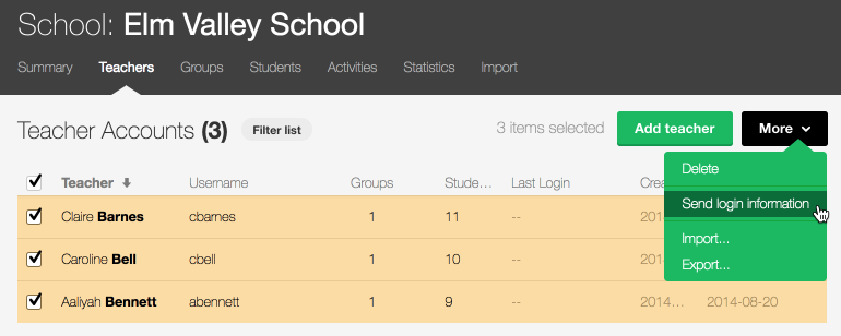 - Click the Teachers tab, and check off the teachers in the list to whom you want to send login information.
