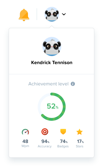 Students will be able to access the brand new achievements panel at any time from their avatar, allowing them to quickly check how far they have come. It will show them a new achievement level, badges collected and stars won, as well as their average speed and accuracy.
