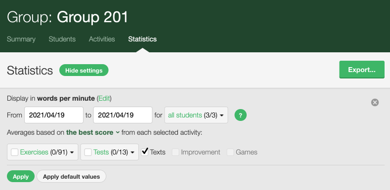 In the group management interface, select the Statistics (A) tab. Enter the date of the competition in the two fields to get only that day’s result. Select Averages based on the best score and uncheck all activities except Texts. Click Apply (B), then click Export (C).