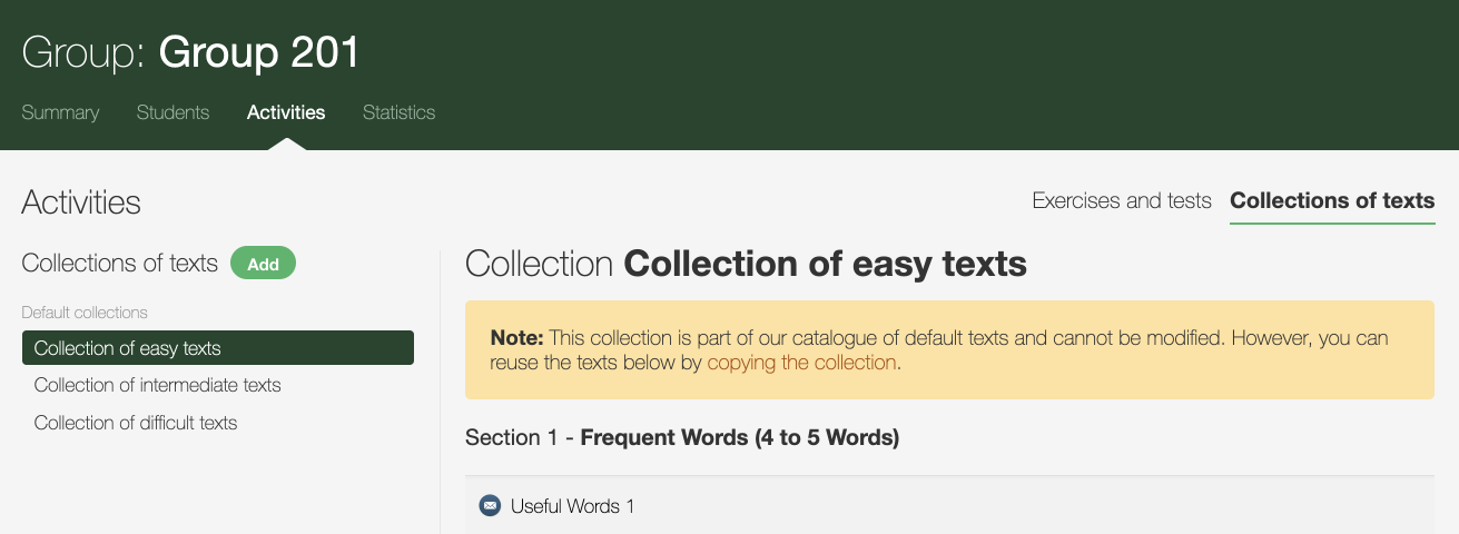 Note—Add a single text to each collection to ensure that students can access only the appropriate text during the competition. If you have different texts for different grades, we recommend creating a collection for each.