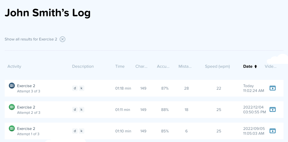 It can provide a more recent picture of a student’s progress, for example. Say a student has been touch typing for several months: the averages displayed are calculated for their entire training period. However, it’s likely their latest results are much better than those they achieved when they first started out. Using the filter to display only activities completed recently will also update the averages displayed for speed and accuracy—higher scores are much more encouraging!