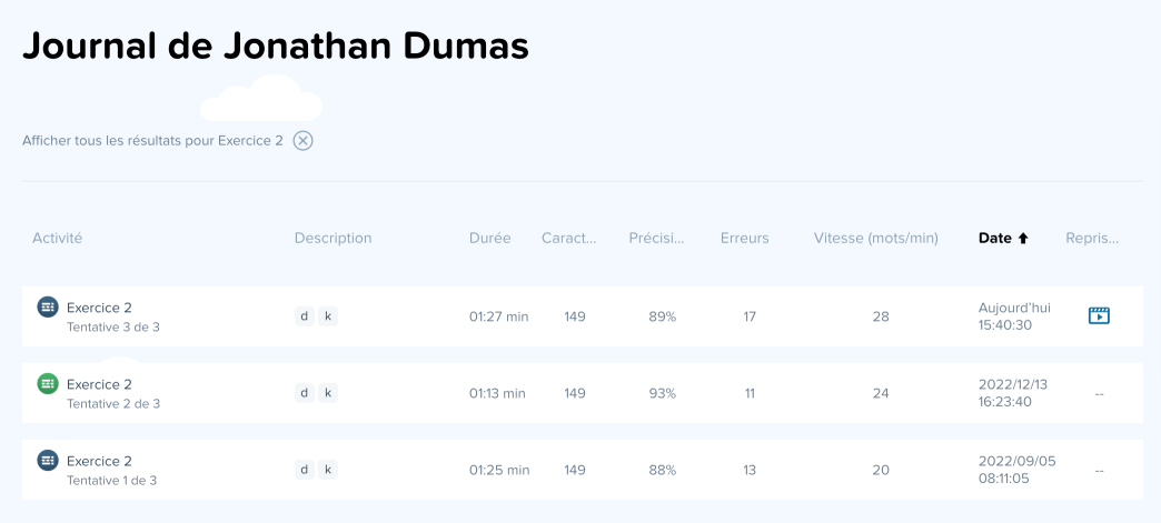 Quand une activité est complétée, un écran indiquait déjà le taux de précision, le nombre d’erreurs et la vitesse, ainsi que les records personnels s’il y a lieu. Cet écran contient maintenant un lien supplémentaire, pour montrer tous les résultats de cette activité en particulier.