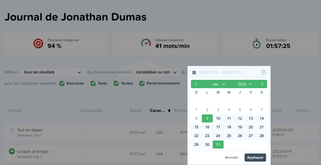 Il peut servir, par exemple, à dresser un portrait plus actuel des résultats. Si l’élève a commencé son entrainement il y a plusieurs mois, les moyennes affichées tiennent compte de toute cette période. Or, il est fort probable que les résultats des premières semaines soient moins bons que ceux du dernier mois. En ne retenant que celui-ci, les moyennes de précision et de vitesse seront plus élevées, ce qui est très encourageant pour l’élève!