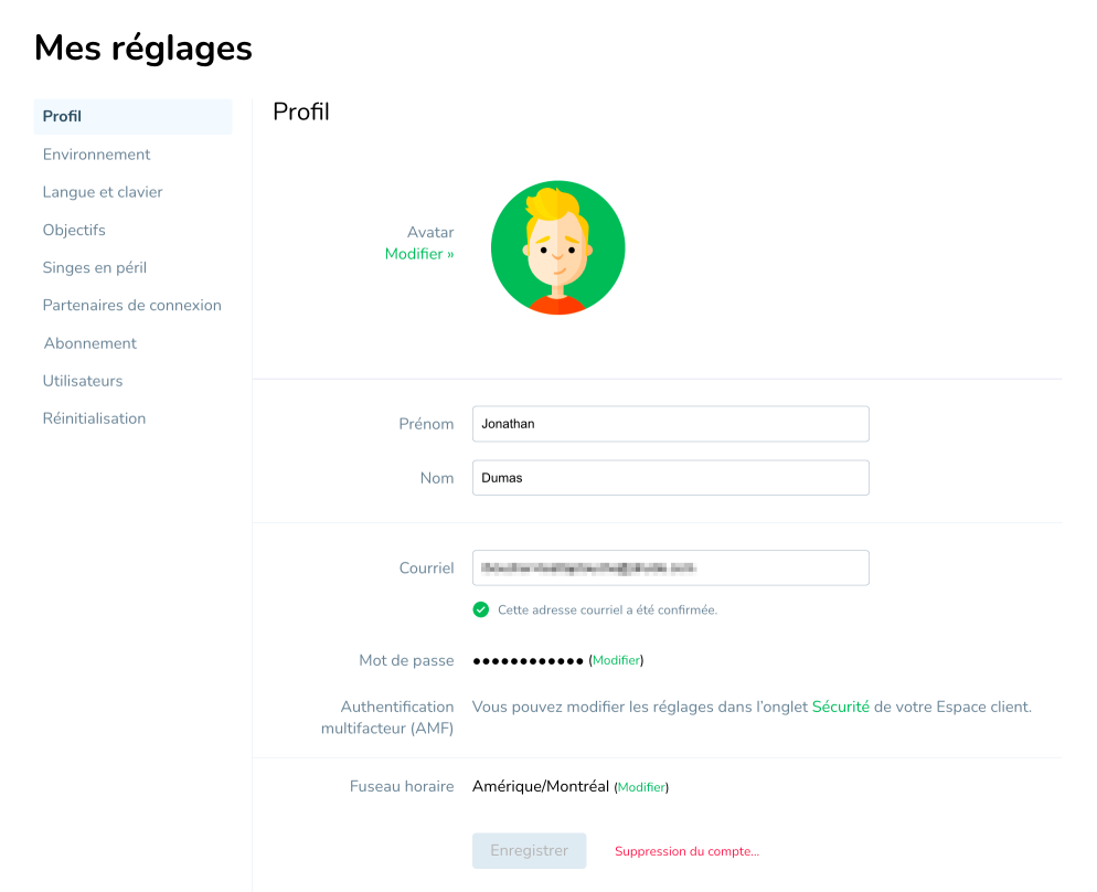 Choisissez votre avatar et mettez à jour vos informations d’identification depuis votre Profil. Pour y accéder, appuyez sur votre identifiant en haut à droite et choisissez l’option Mes réglages dans le menu.