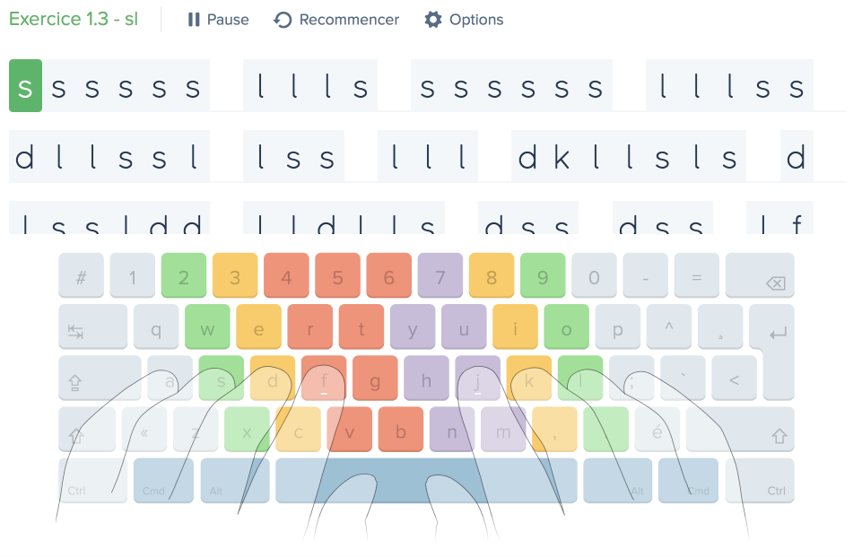 | Les animations humoristiques changent en fonction de la frappe, des erreurs et du résultat final. | Lorsqu’une erreur est détectée, les doigts apparaissent au-dessus du clavier afin de montrer le doigt à utiliser pour taper la bonne touche. |