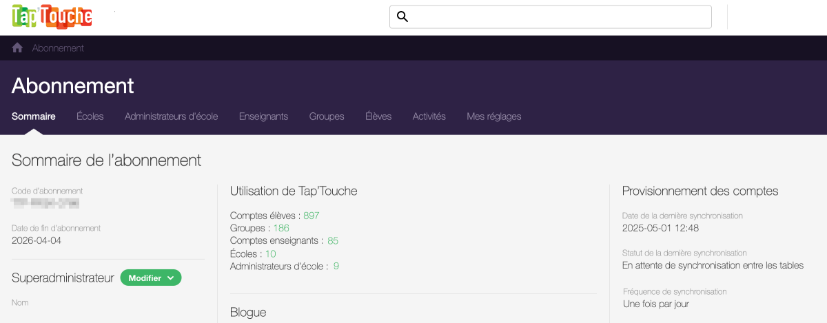 Le superadministrateur peut voir dans le sommaire de l’abonnement quand la dernière synchronisation a été faite.