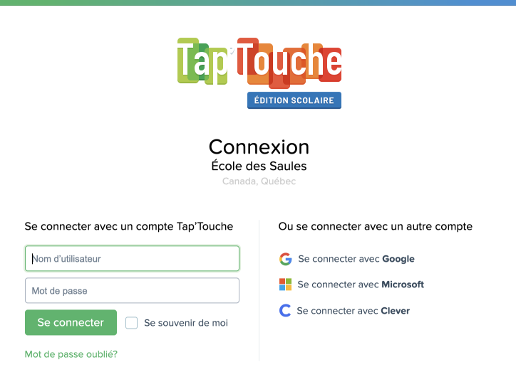 Si vous êtes un administrateur d’école, un enseignant ou un élève, accédez directement à la page de connexion depuis l’URL personnalisée de votre école. Le sous-domaine de l’URL personnalisée correspond généralement au nom de l’établissement, comme c’est le cas ici pour l’école des Érables : https://ecoledeserables.taptouche.com.