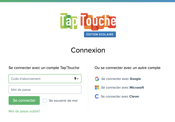 Vous pouvez vous authentifier avec votre identifiant Tap’Touche ou avec un partenaire de connexion, soit Google, Microsoft ou Clever.