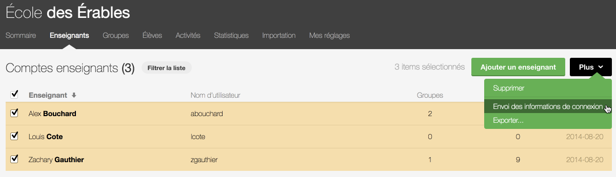 - Cliquez sur l’onglet Enseignants et cochez les enseignants de la liste à qui vous voulez envoyer les informations de connexion.