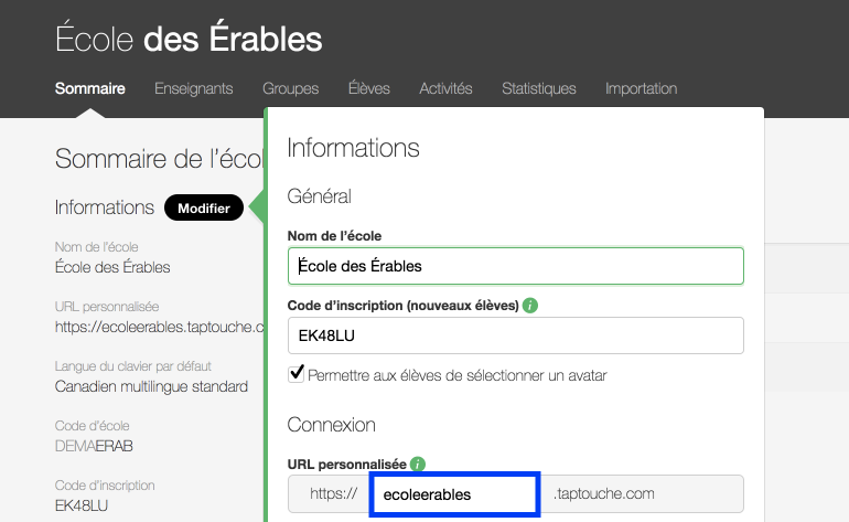 Conseil — En cours d’année, si vous modifiez l’URL personnalisée alors que les enseignants et les élèves utilisent déjà Tap’Touche, assurez-vous de leur transmettre la nouvelle version au plus vite.