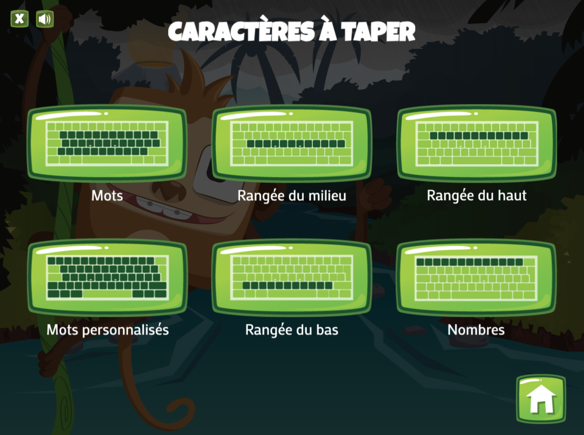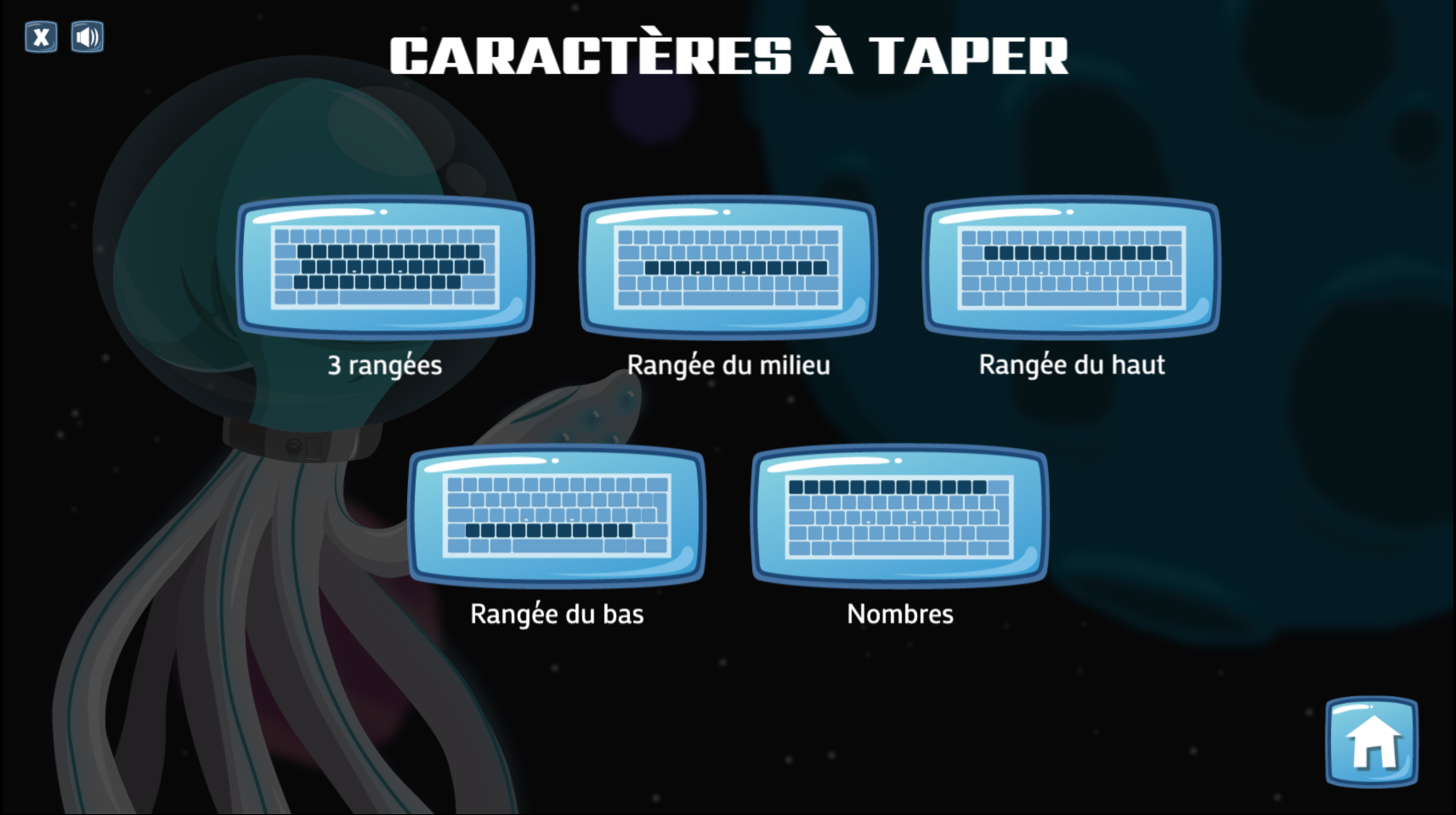 Les élèves peuvent choisir parmi six modes de jeu, chacun ciblant une ou des rangées du clavier. Après avoir maitrisé la position des doigts avec des suites de caractères par rangée, combinez les rangées pour taper des mots.