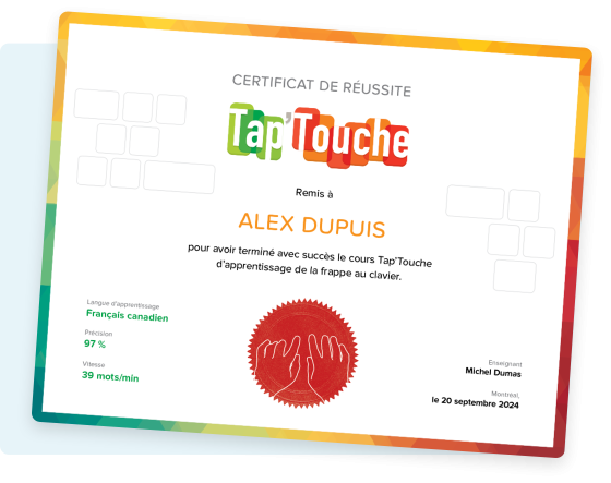 Tap’Touche permet à vos élèves d’apprendre ou de perfectionner leur technique de frappe tout en s’amusant. Bien plus, il vous offre de puissants outils pour gérer vos comptes utilisateurs et personnaliser la formation offerte.