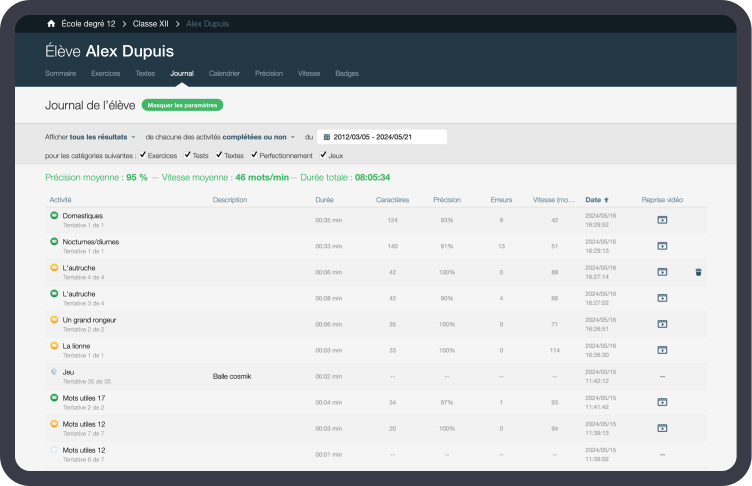 Consultez le journal de vos élèves pour évaluer leur performance. Des reprises vidéo vous permettent de déterminer les forces et faiblesses de chacun. Choisissez votre système de notation et générez les notes du bulletin sans quitter vos rapports statistiques.