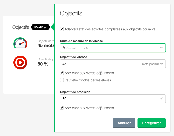 Pour ce faire, rendez-vous au Sommaire du groupe. Cliquez sur le bouton Modifier de la tuile centrale Objectifs, puis cochez les options Adapter l’état des activités complétées aux objectifs courants et Appliquer aux élèves déjà inscrits. Une fois ces paramètres enregistrés, le statut visuel des exercices reflètera la mise à jour des objectifs par rapport au meilleur résultat enregistré pour chaque activité.